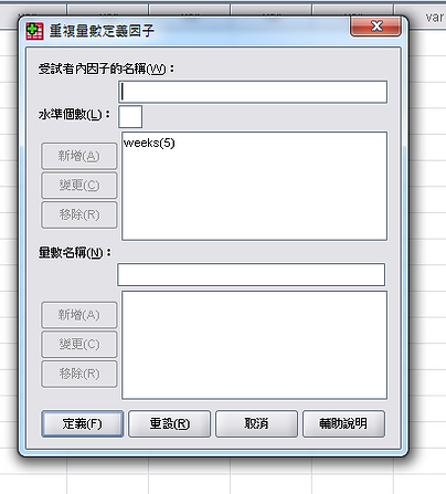 在重複量數中,我們並不把五週的成績排在同一行變項,而是採取較直觀的方式key in,如下圖: