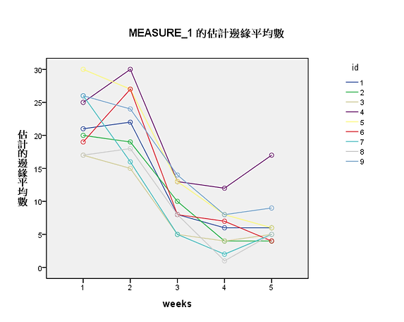 分析→一般線性模式→重複量數→圖形. 將weeks放入水平軸,按新增→繼續. 按確定,執行分析就會出現.