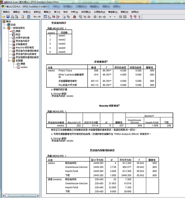 由受試者內效應項的檢定,"假設為球形"那欄,顯示9位受試者在這5週的分數是有明顯變化的,p=.000